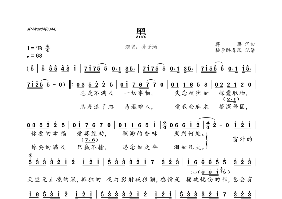 《黑》是孙子涵演唱的一首歌曲,拍号为4/4拍,歌曲速度为每分钟68拍,这份简谱共有一张高清图谱,图谱由 @桃李醉春风 编配上传。
