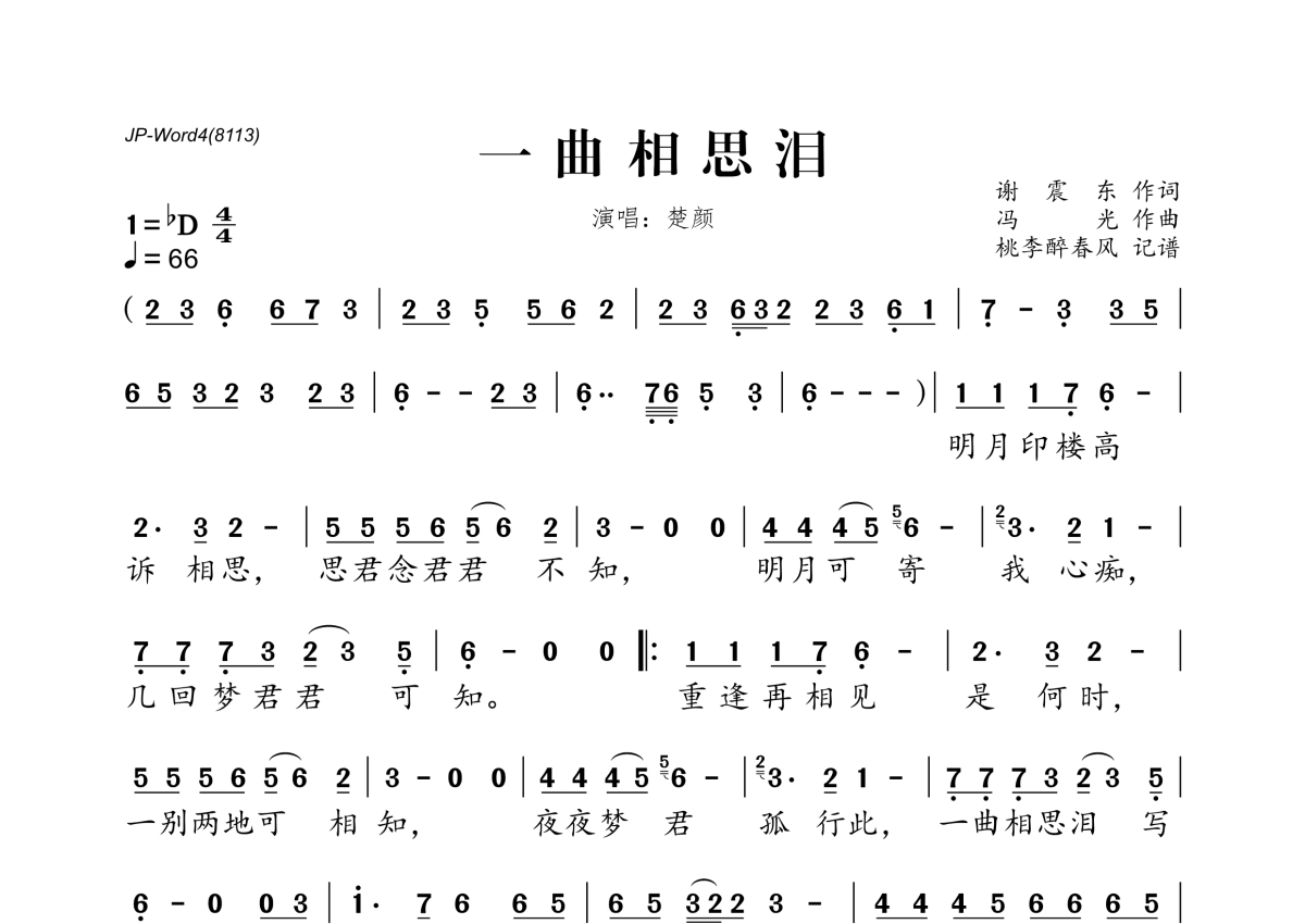 《一曲相思泪》是楚颜演唱的一首歌曲,拍号为4/4拍,歌曲速度为每分钟66拍,这份简谱共有一张高清图谱,图谱由 @桃李醉春风 编配上传。