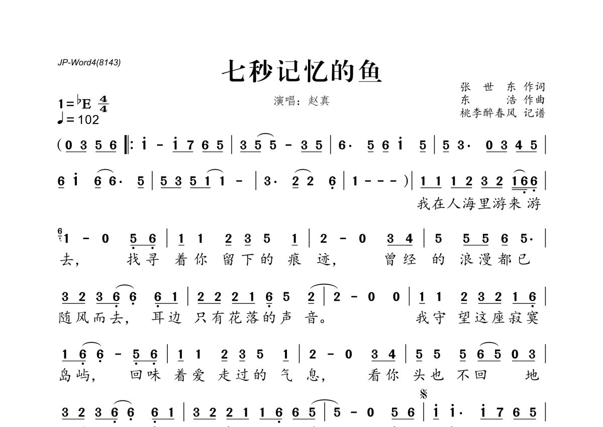《七秒记忆的鱼》是赵真演唱的一首歌曲,拍号为4/4拍,歌曲速度为每分钟102拍,这份简谱共有一张高清图谱,图谱由 @桃李醉春风 编配上传。