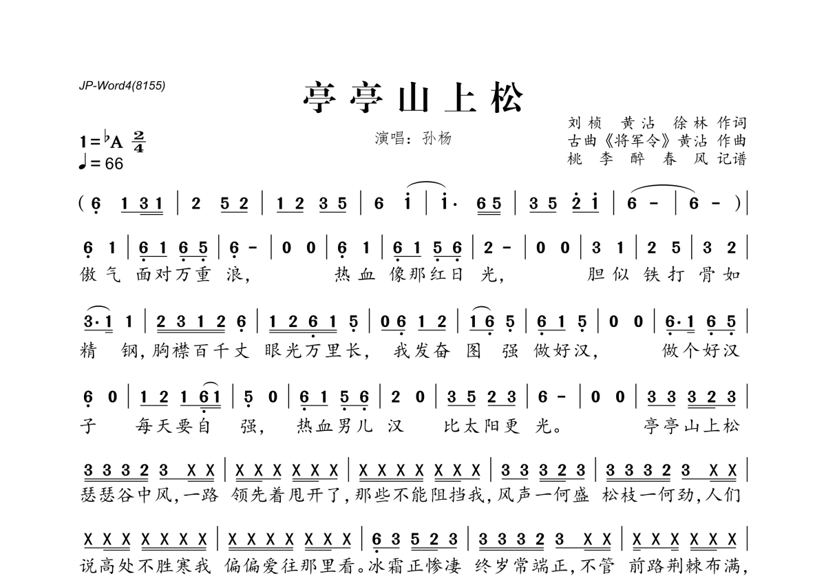《亭亭山上松》是孙杨演唱的一首歌曲,拍号为2/4拍,歌曲速度为每分钟66拍,这份简谱共有一张高清图谱,图谱由 @桃李醉春风 编配上传。