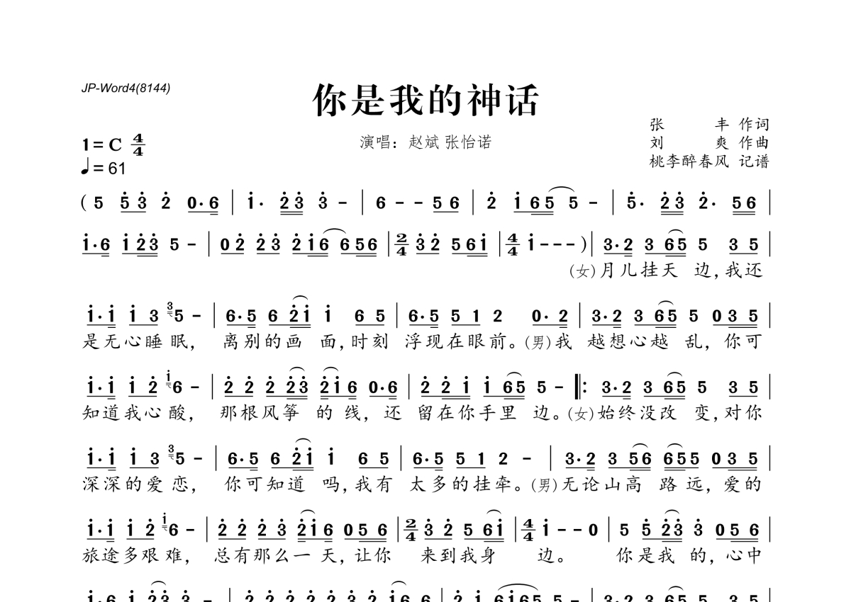 赵斌&张怡诺《你是我的神话》简谱
