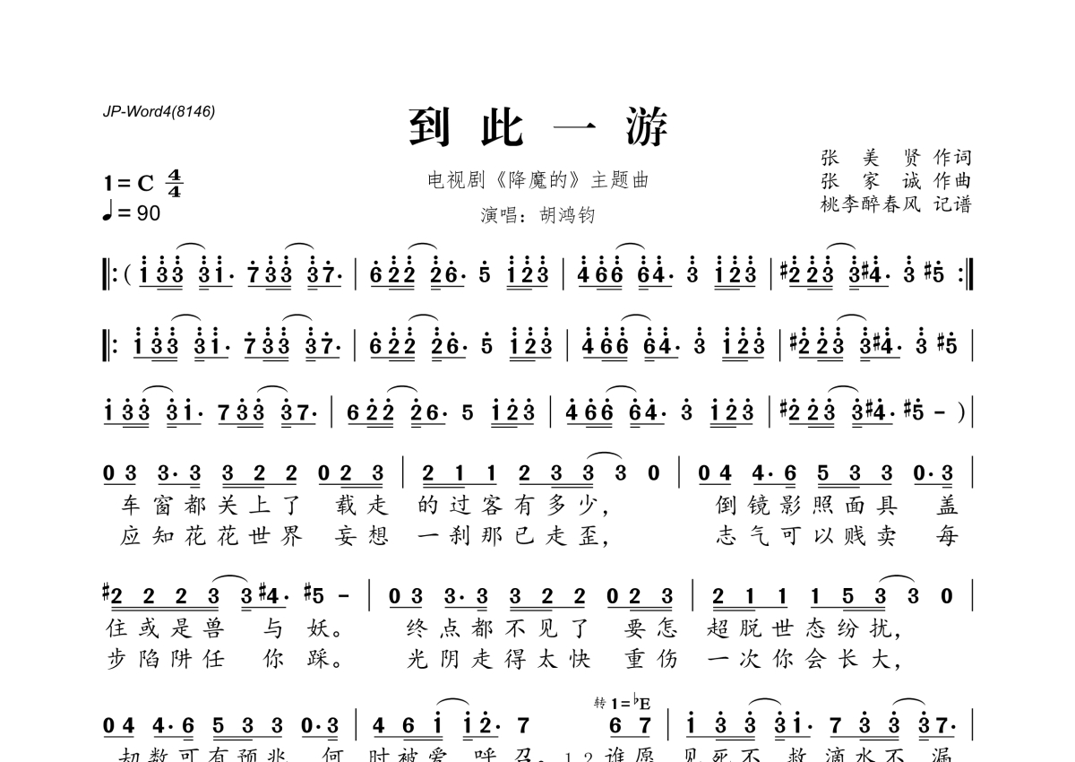 《到此一游》是胡鸿钧演唱的一首歌曲,拍号为4/4拍,歌曲速度为每分钟90拍,这份简谱共有一张高清图谱,图谱由 @桃李醉春风 编配上传。