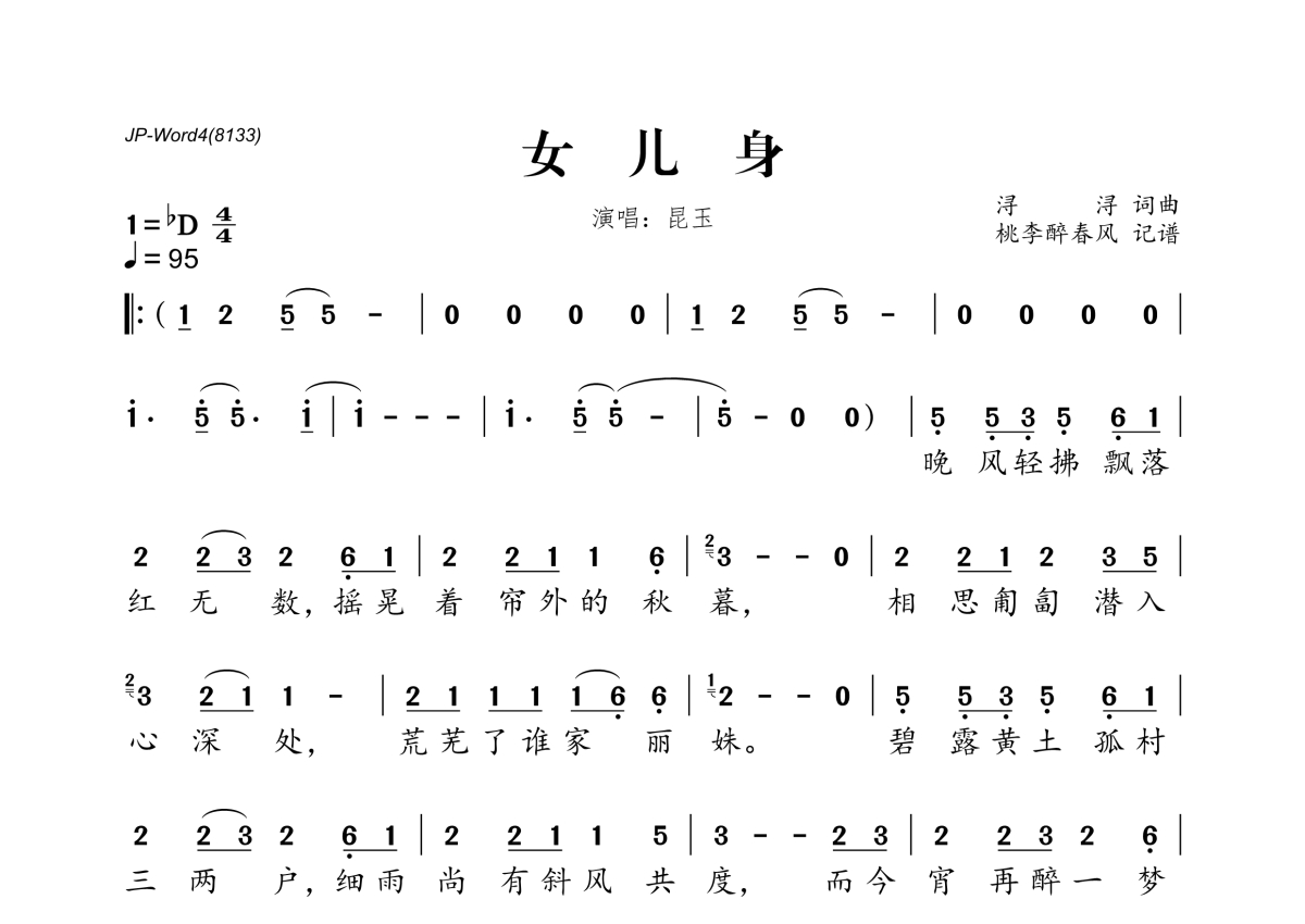 《女儿身》是昆玉演唱的一首歌曲,拍号为4/4拍,歌曲速度为每分钟95拍,这份简谱共有一张高清图谱,图谱由 @桃李醉春风 编配上传。