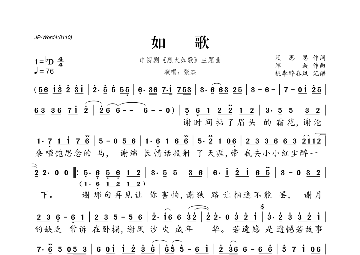 《如歌》是张杰演唱的一首歌曲,拍号为4/4拍,歌曲速度为每分钟76拍,这份简谱共有一张高清图谱,图谱由 @桃李醉春风 编配上传。