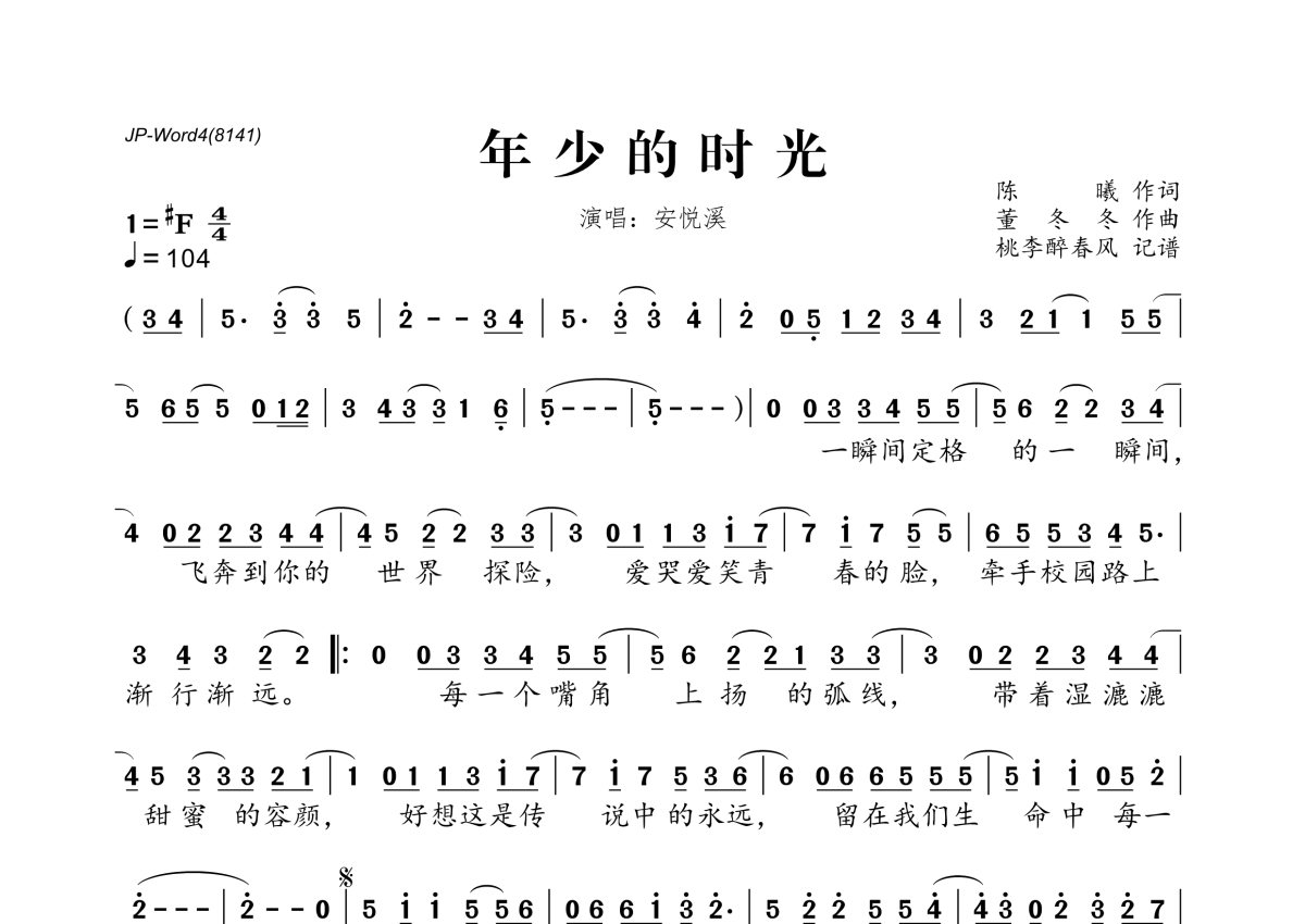《年少的时光》是安悦溪演唱的一首歌曲,拍号为4/4拍,歌曲速度为每分钟104拍,这份简谱共有一张高清图谱,图谱由 @桃李醉春风 编配上传。