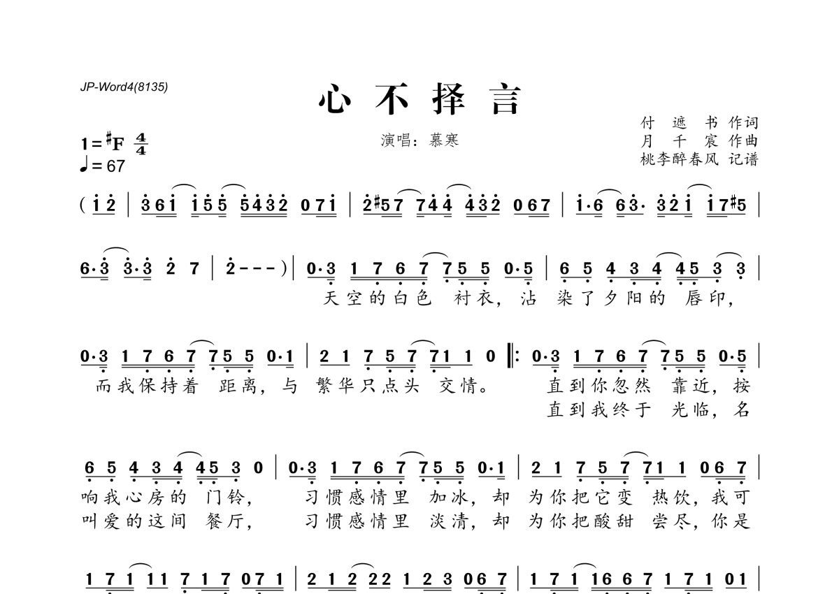 《心不择言》是慕寒演唱的一首歌曲,拍号为4/4拍,歌曲速度为每分钟67拍,这份简谱共有两张高清图谱,图谱由 @桃李醉春风 编配上传。