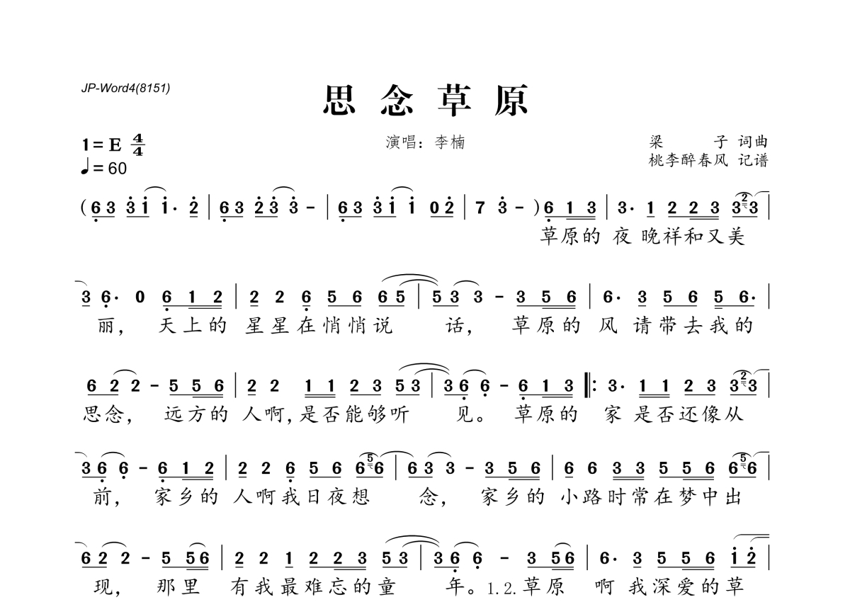 《思念草原》是李楠演唱的一首歌曲,拍号为4/4拍,歌曲速度为每分钟60拍,这份简谱共有一张高清图谱,图谱由 @桃李醉春风 编配上传。