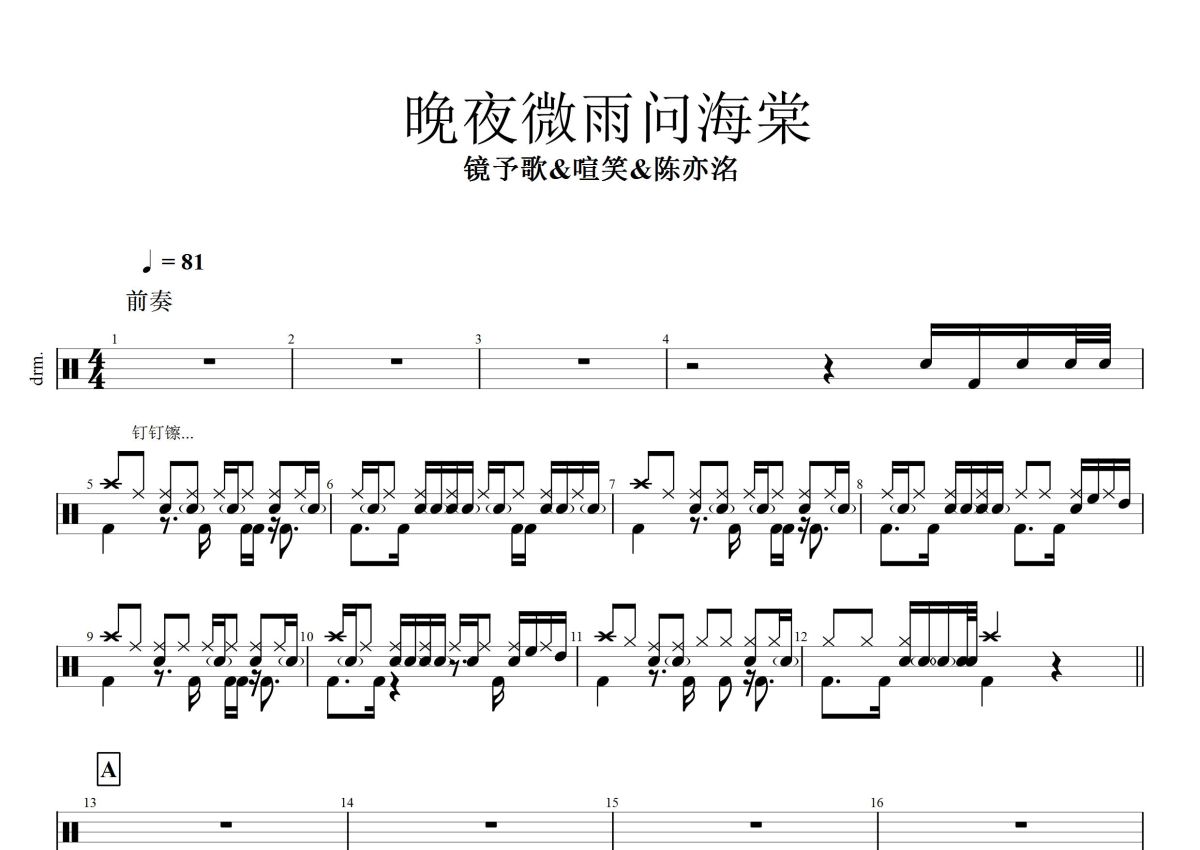 镜予歌/喧笑/陈亦洺《晚夜微雨问海棠》鼓谱 - 架子鼓谱