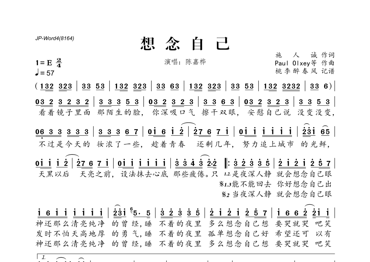《想念自己》是陈嘉桦演唱的一首歌曲,拍号为2/4拍,歌曲速度为每分钟57拍,这份简谱共有一张高清图谱,图谱由 @桃李醉春风 编配上传。