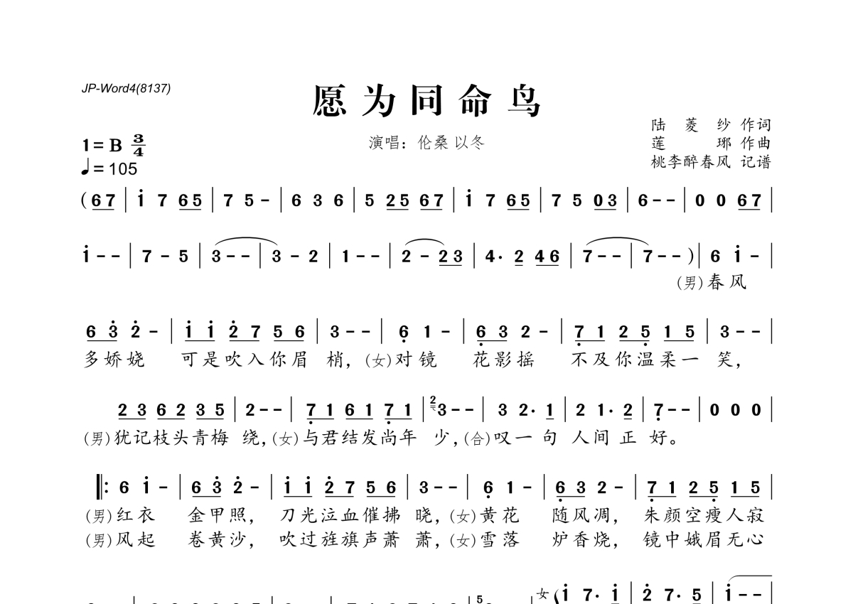 《愿为同命鸟》是伦桑&以冬演唱的一首歌曲,拍号为3/4拍,歌曲速度为每分钟105拍,这份简谱共有两张高清图谱,图谱由 @桃李醉春风 编配上传。