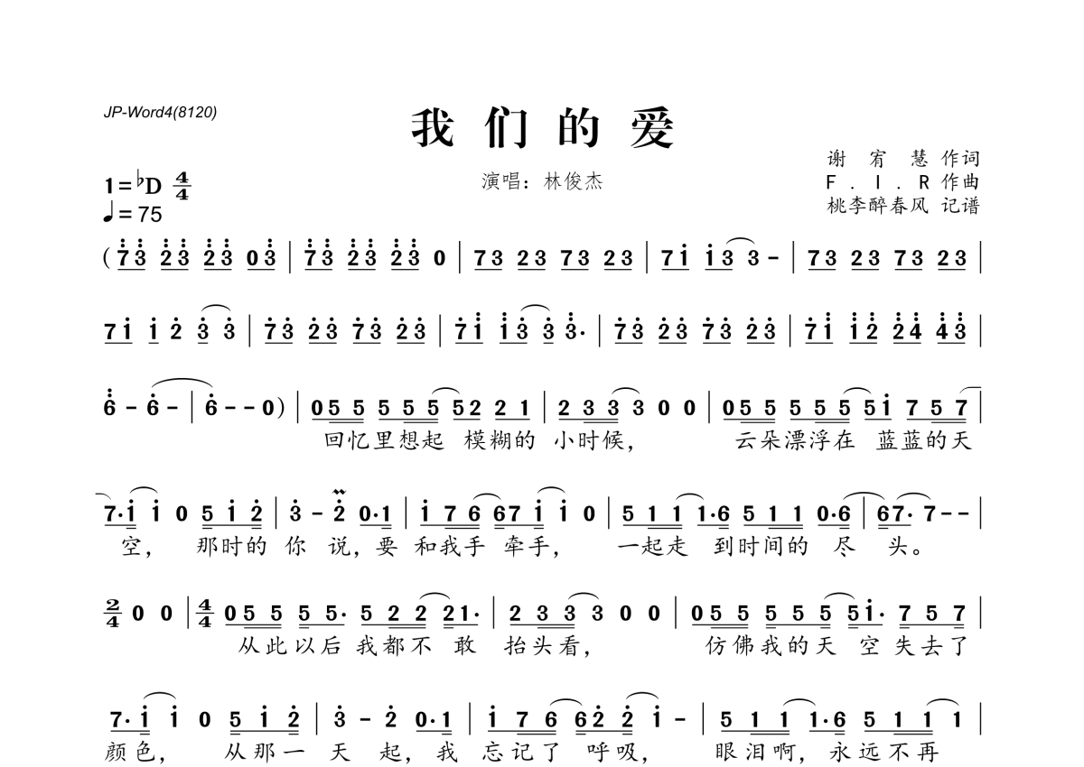《我们的爱》是林俊杰演唱的一首歌曲,拍号为4/4拍,歌曲速度为每分钟75拍,这份简谱共有两张高清图谱,图谱由 @桃李醉春风 编配上传。