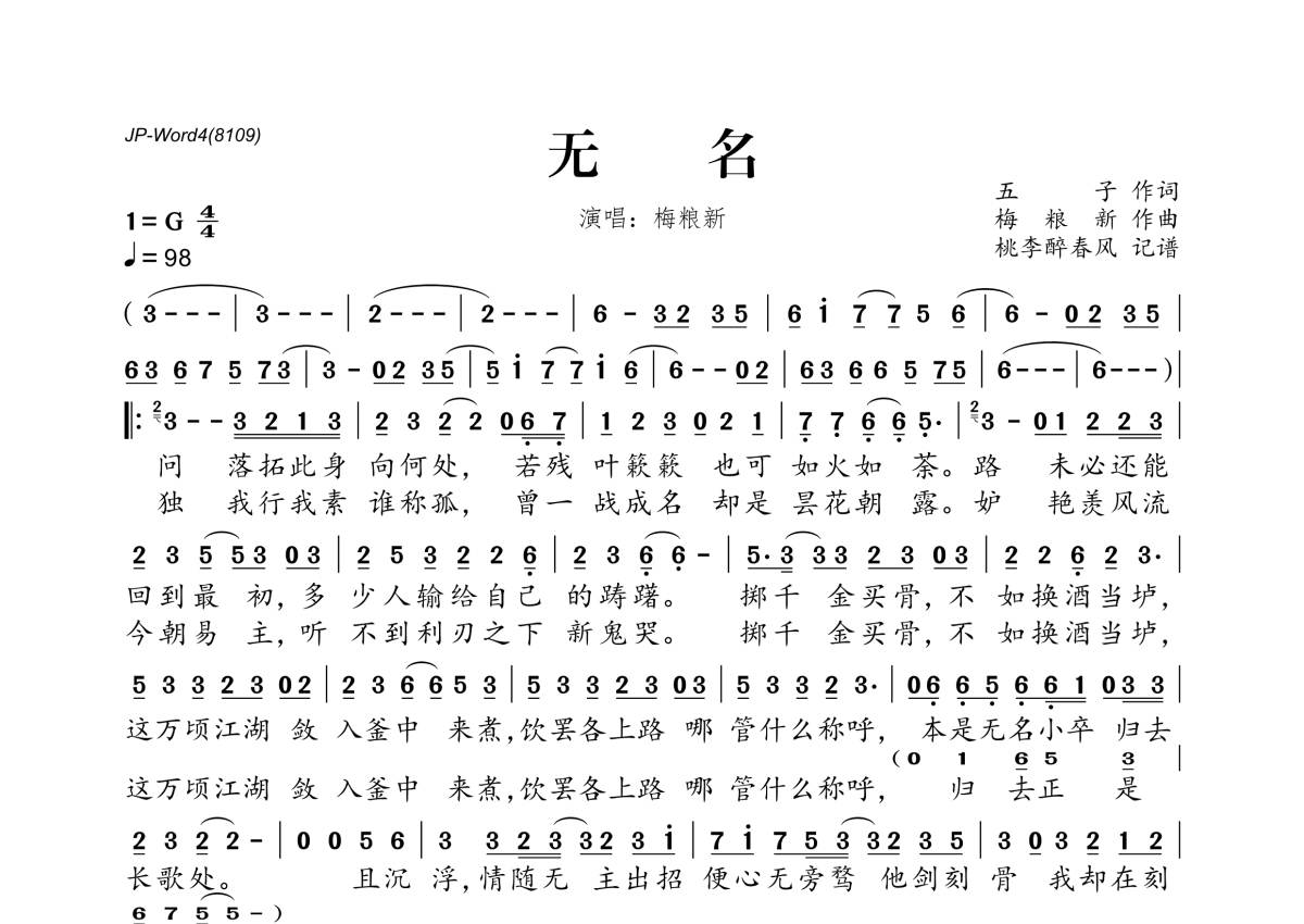 《无名》是梅粮新演唱的一首歌曲,拍号为4/4拍,歌曲速度为每分钟98拍,这份简谱共有一张高清图谱,图谱由 @桃李醉春风 编配上传。
