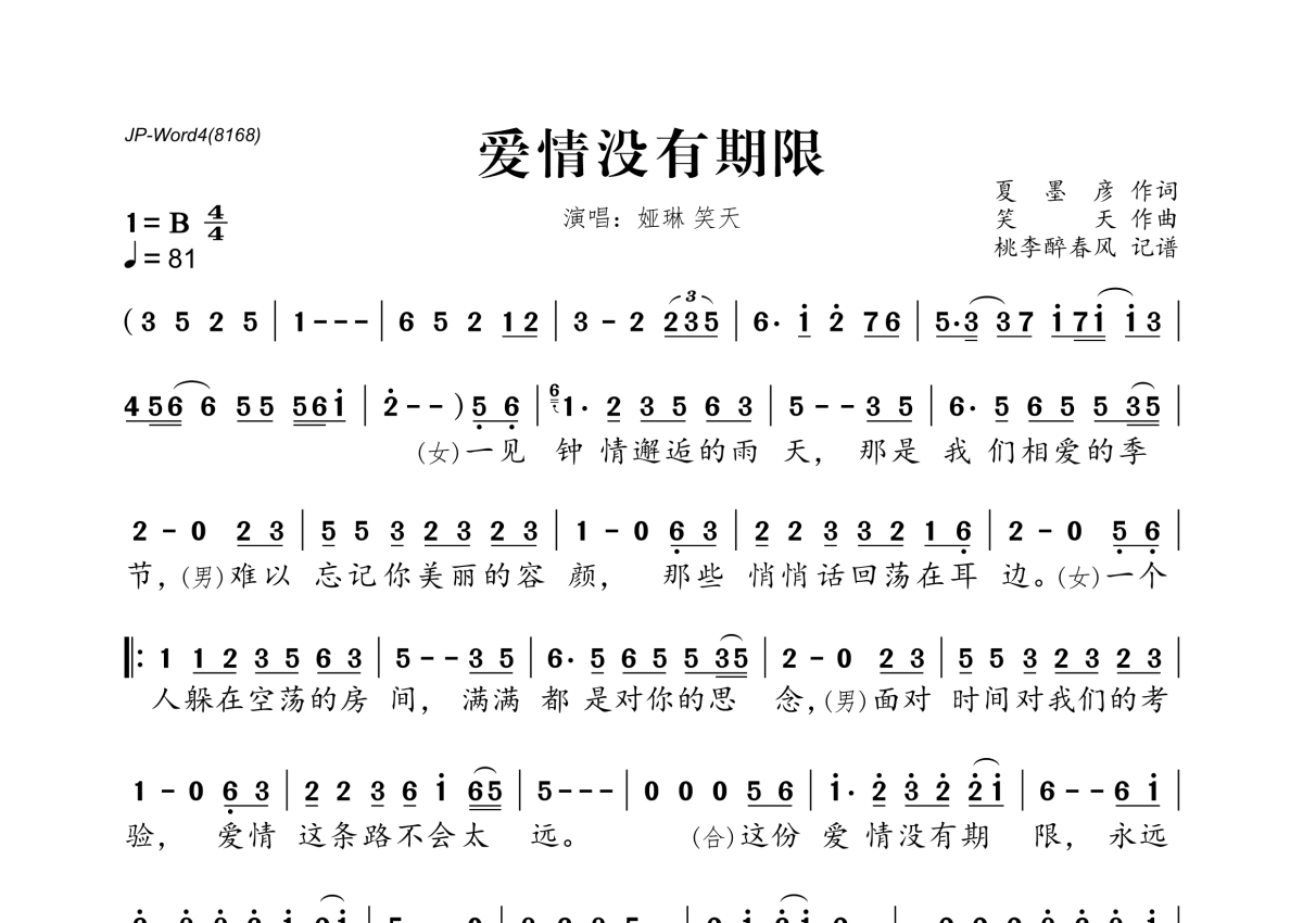 《爱情没有期限》是娅琳&笑天演唱的一首歌曲,拍号为4/4拍,歌曲速度为每分钟81拍,这份简谱共有一张高清图谱,图谱由 @桃李醉春风 编配上传。