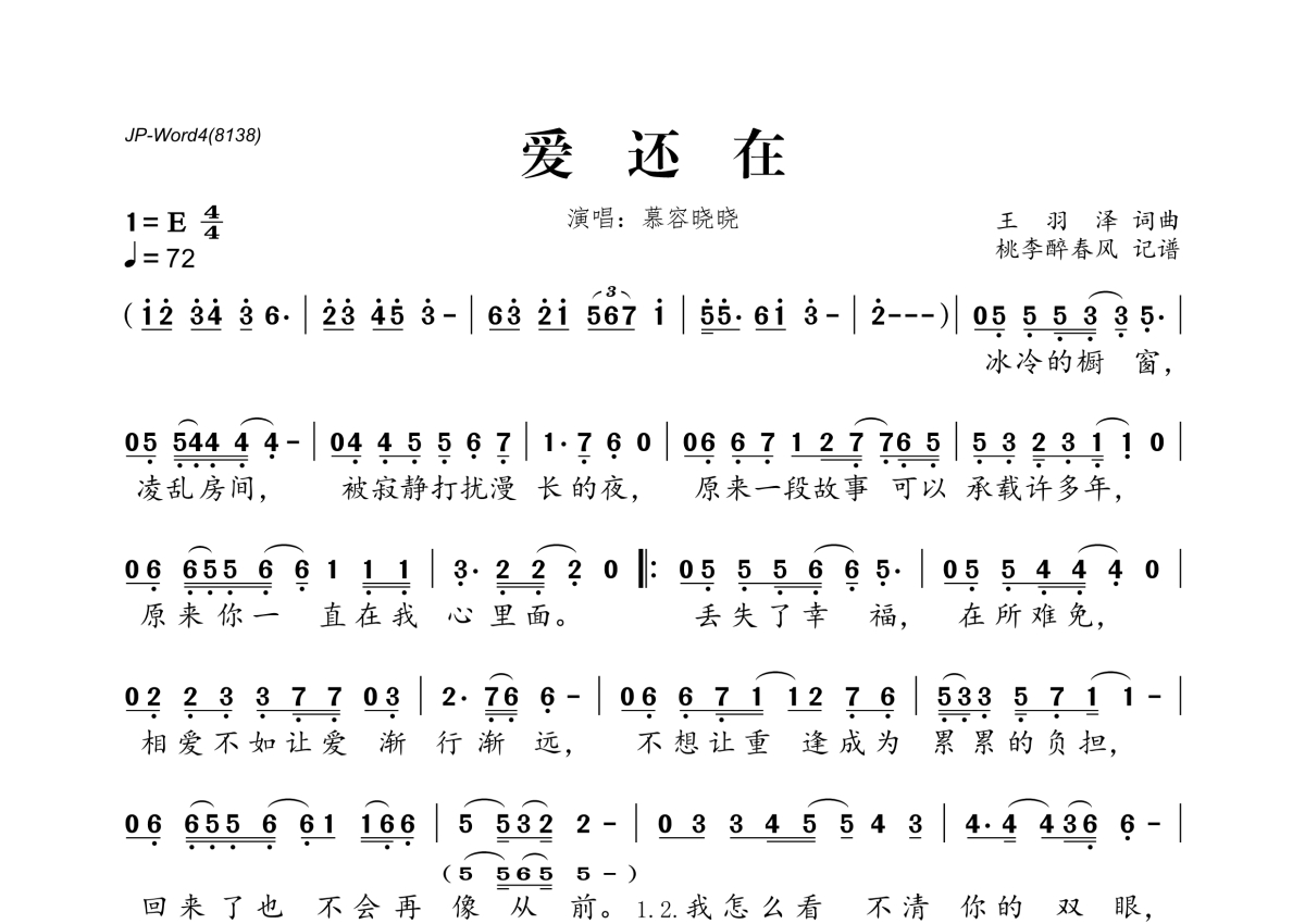 《爱还在》是慕容晓晓演唱的一首歌曲,拍号为4/4拍,歌曲速度为每分钟72拍,这份简谱共有一张高清图谱,图谱由 @桃李醉春风 编配上传。