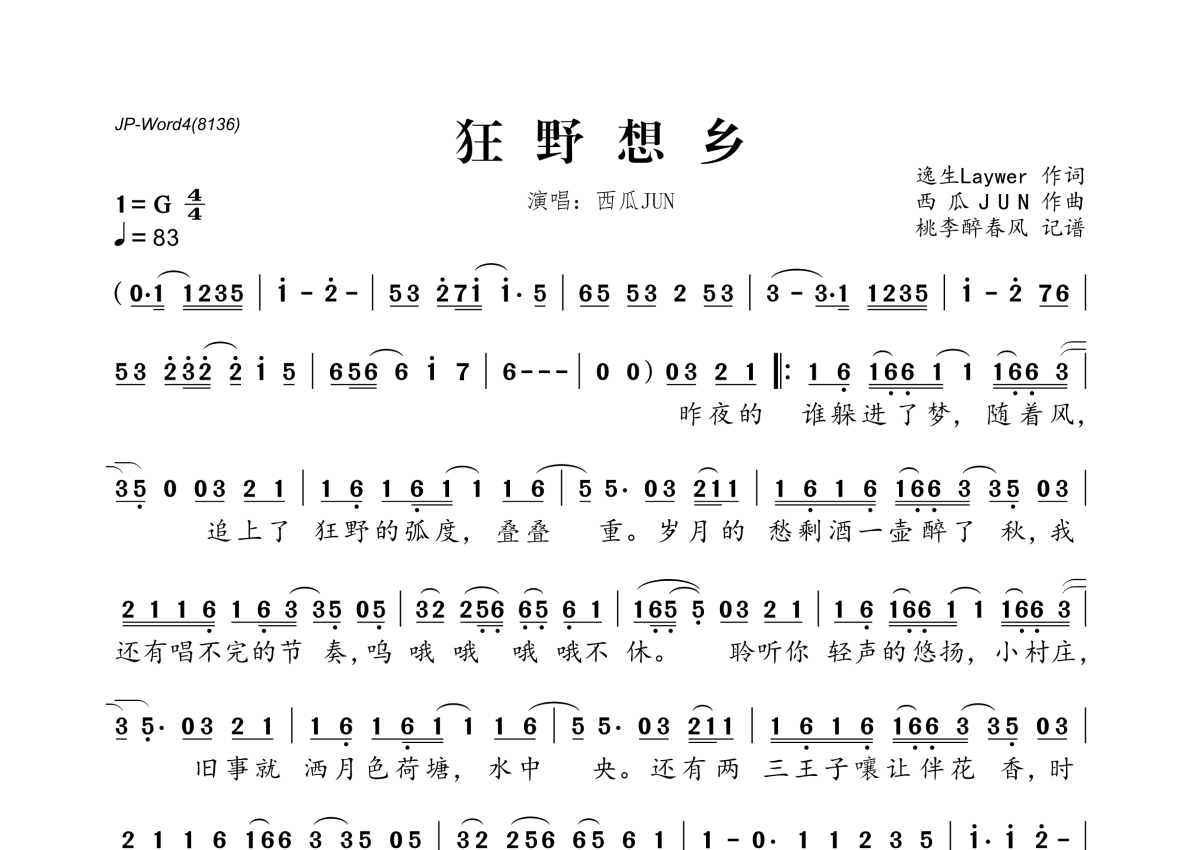 《狂野想乡》是西瓜JUN演唱的一首歌曲,拍号为4/4拍,歌曲速度为每分钟83拍,这份简谱共有一张高清图谱,图谱由 @桃李醉春风 编配上传。