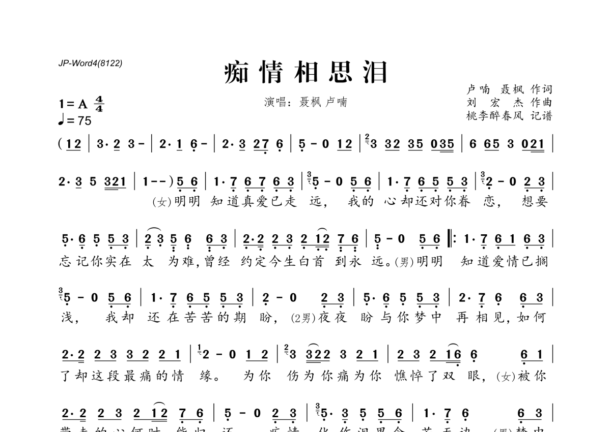 《痴情相思泪》是卢喃&聂枫演唱的一首歌曲,拍号为4/4拍,歌曲速度为每分钟75拍,这份简谱共有一张高清图谱,图谱由 @桃李醉春风 编配上传。