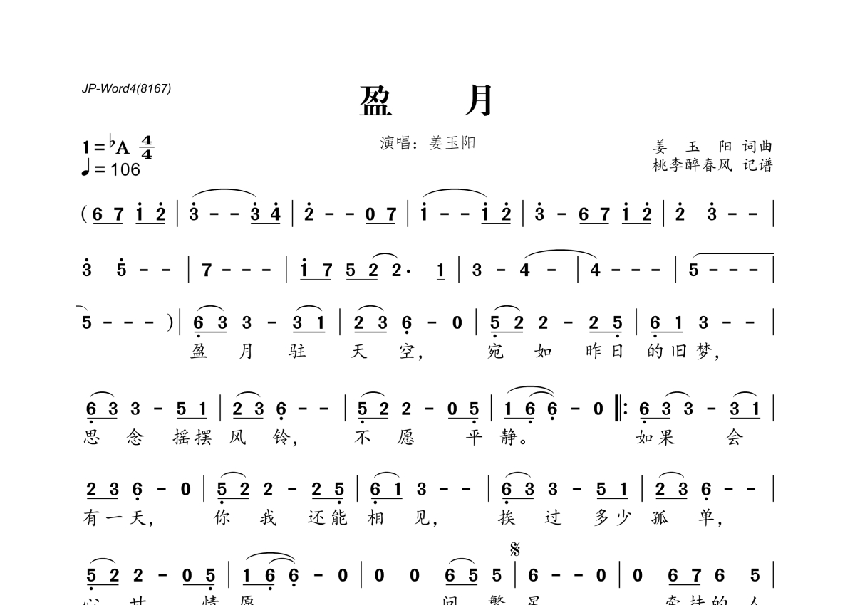 《盈月》是姜玉阳演唱的一首歌曲,拍号为4/4拍,歌曲速度为每分钟106拍,这份简谱共有一张高清图谱,图谱由 @桃李醉春风 编配上传。