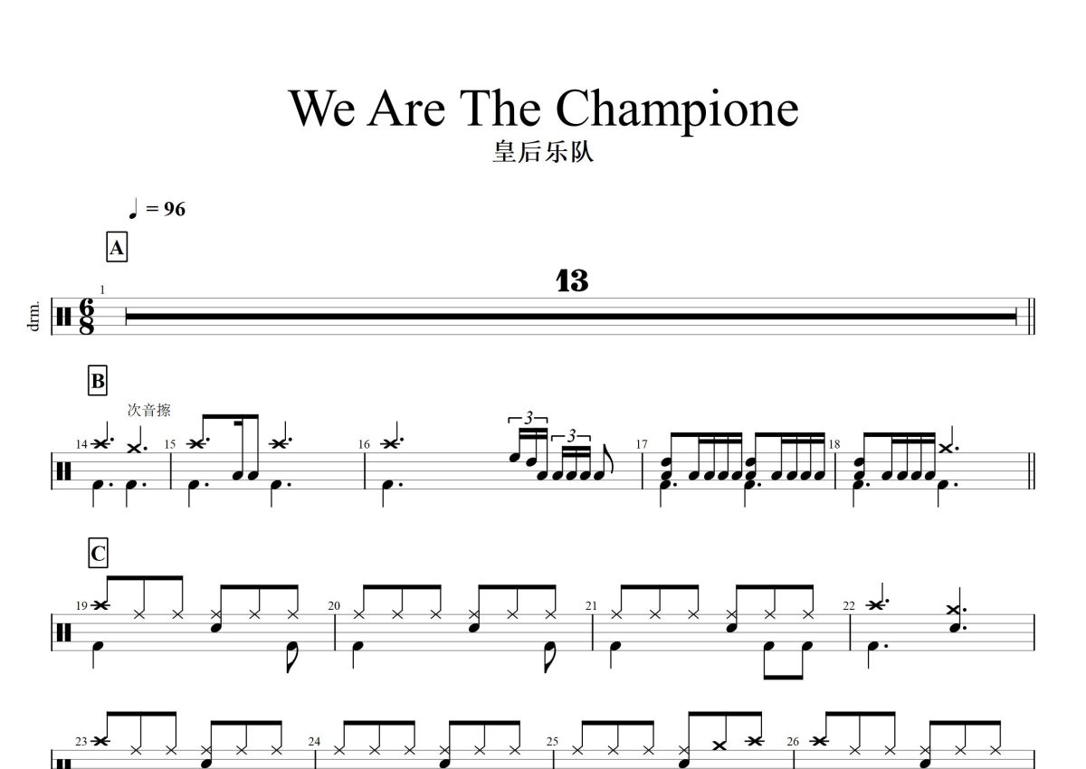 《We Are The Champione》是皇后乐队演唱的一首歌曲,这份鼓谱共有三张高清图谱,图谱由 @打鼓谱 编配上传,图谱使用五线谱编配,使用这份We Are The Champione架子鼓谱,你将能够轻松地敲打出这首皇后乐队的We Are The Champione,快来尝试吧。《We are the champions》是皇后乐队演唱的一首歌曲,词曲由乐队主唱佛莱迪·摩克瑞创作。该曲发行于1977年7月10日,后收录于乐队同年10月28日发行的第六张录音室专辑《News of the World》中 。