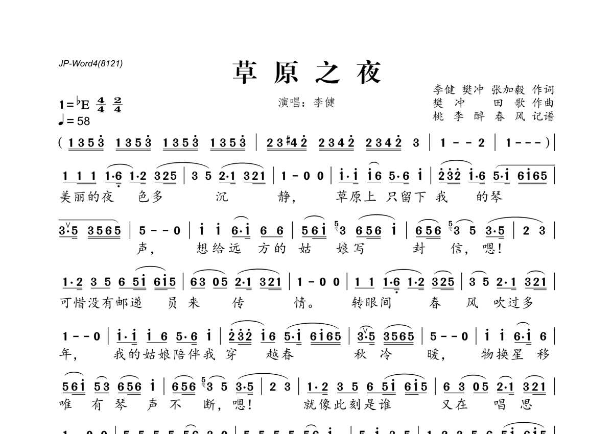 《草原之夜》是李健演唱的一首歌曲,拍号为4/4拍,歌曲速度为每分钟58拍,这份简谱共有一张高清图谱,图谱由 @桃李醉春风 编配上传。