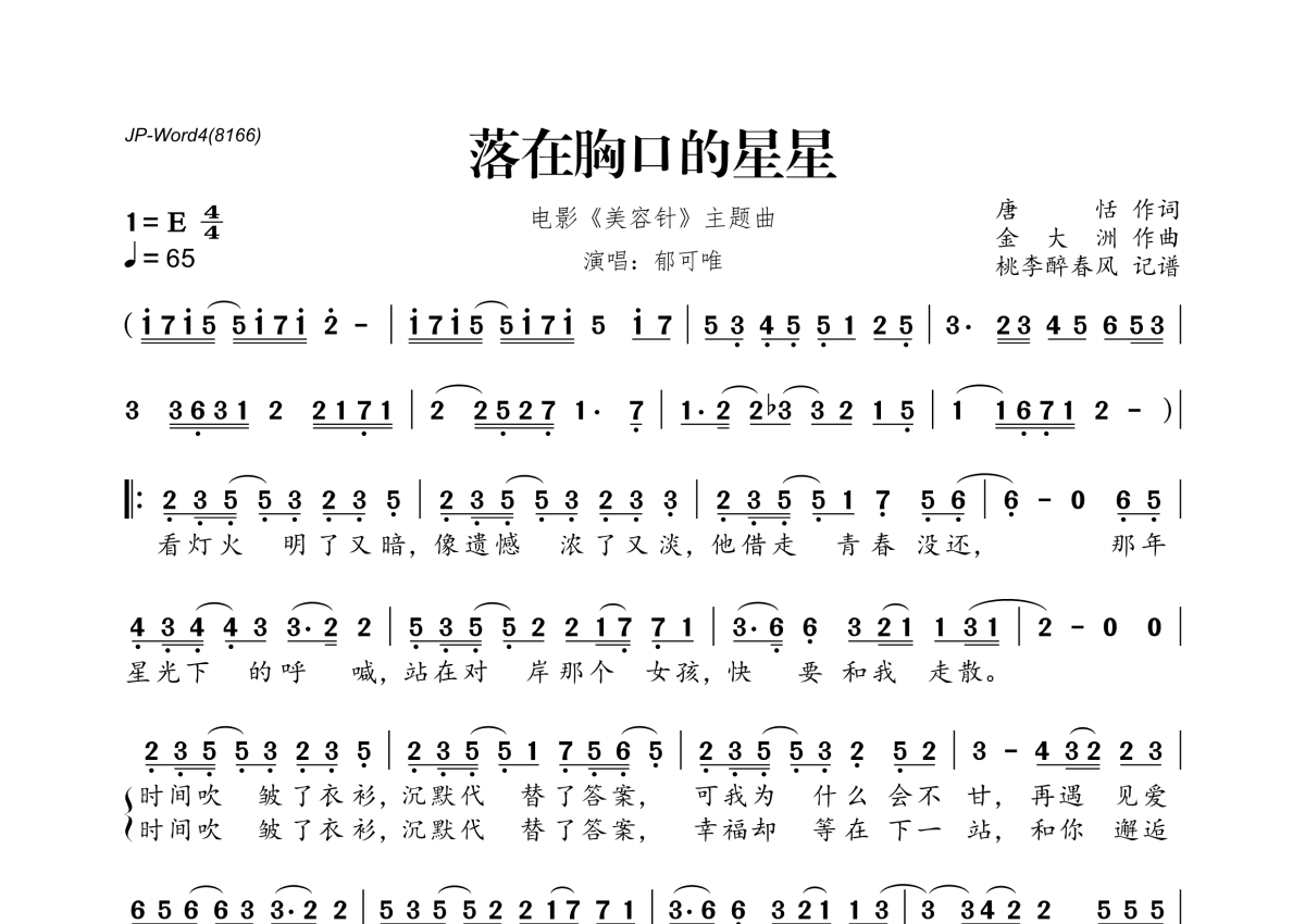 《落在胸口的星星》是郁可唯演唱的一首歌曲,拍号为4/4拍,歌曲速度为每分钟65拍,这份简谱共有一张高清图谱,图谱由 @桃李醉春风 编配上传。