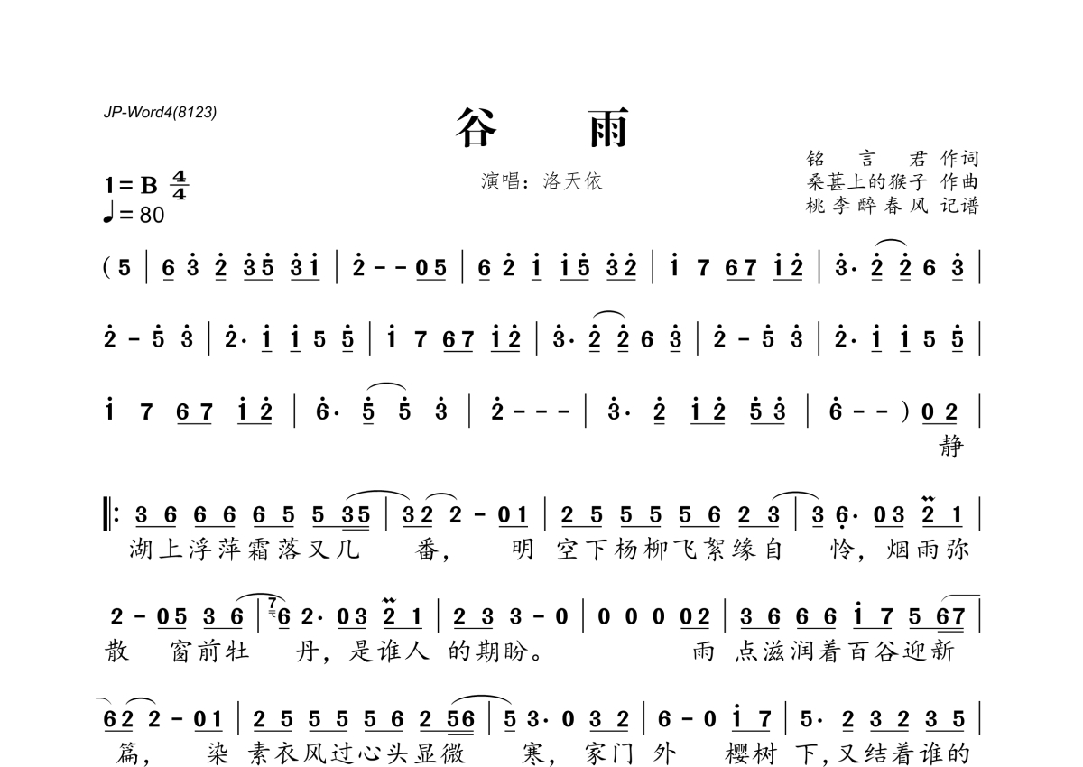 《谷雨》是洛天依演唱的一首歌曲,拍号为4/4拍,歌曲速度为每分钟80拍,这份简谱共有一张高清图谱,图谱由 @桃李醉春风 编配上传。
