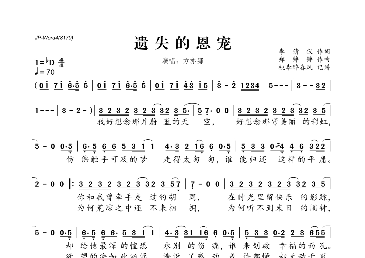 遗失的恩宠简谱 - 方亦娜演唱