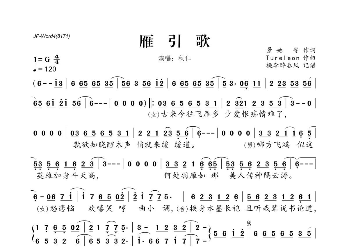《雁引歌》是秋仁演唱的一首歌曲,拍号为4/4拍,歌曲速度为每分钟120拍,这份简谱共有一张高清图谱,图谱由 @桃李醉春风 编配上传。