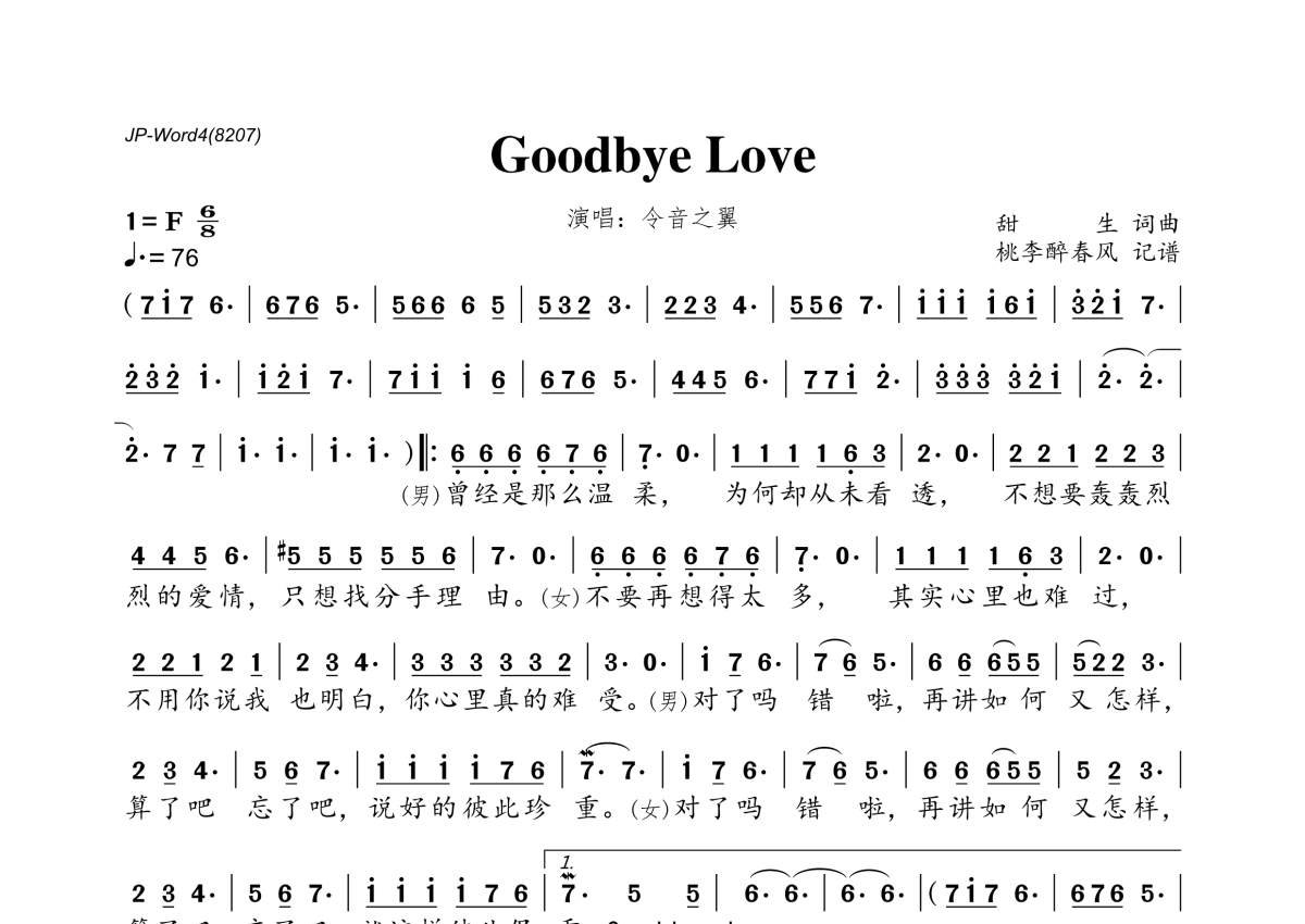 《Goodbye Love》是令音之翼演唱的一首歌曲,拍号为6/8拍,歌曲速度为每分钟76拍,这份简谱共有一张高清图谱,图谱由 @桃李醉春风 编配上传。