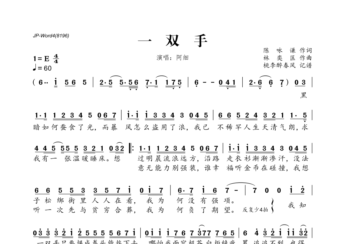 《一双手》是阿细演唱的一首歌曲,拍号为4/4拍,歌曲速度为每分钟60拍,这份简谱共有一张高清图谱,图谱由 @桃李醉春风 编配上传。