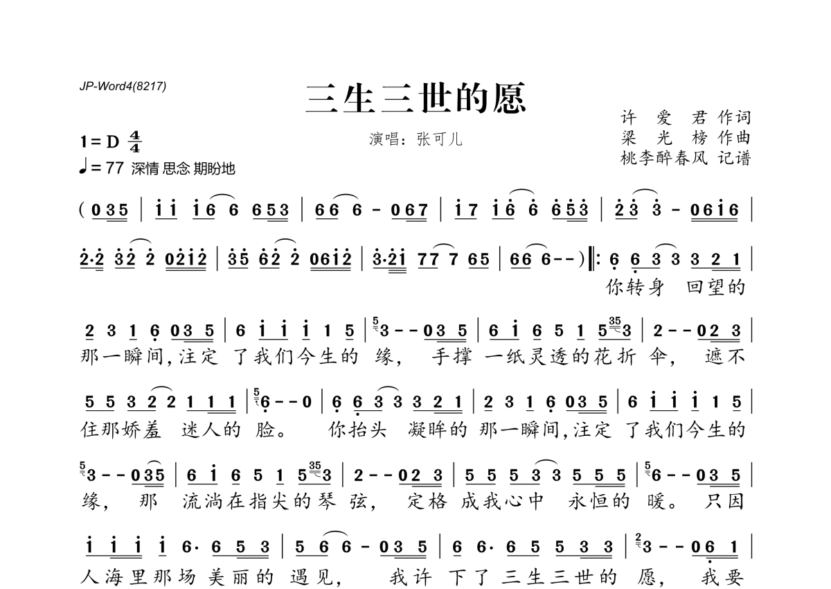 三生三世的愿简谱 - 张可儿演唱