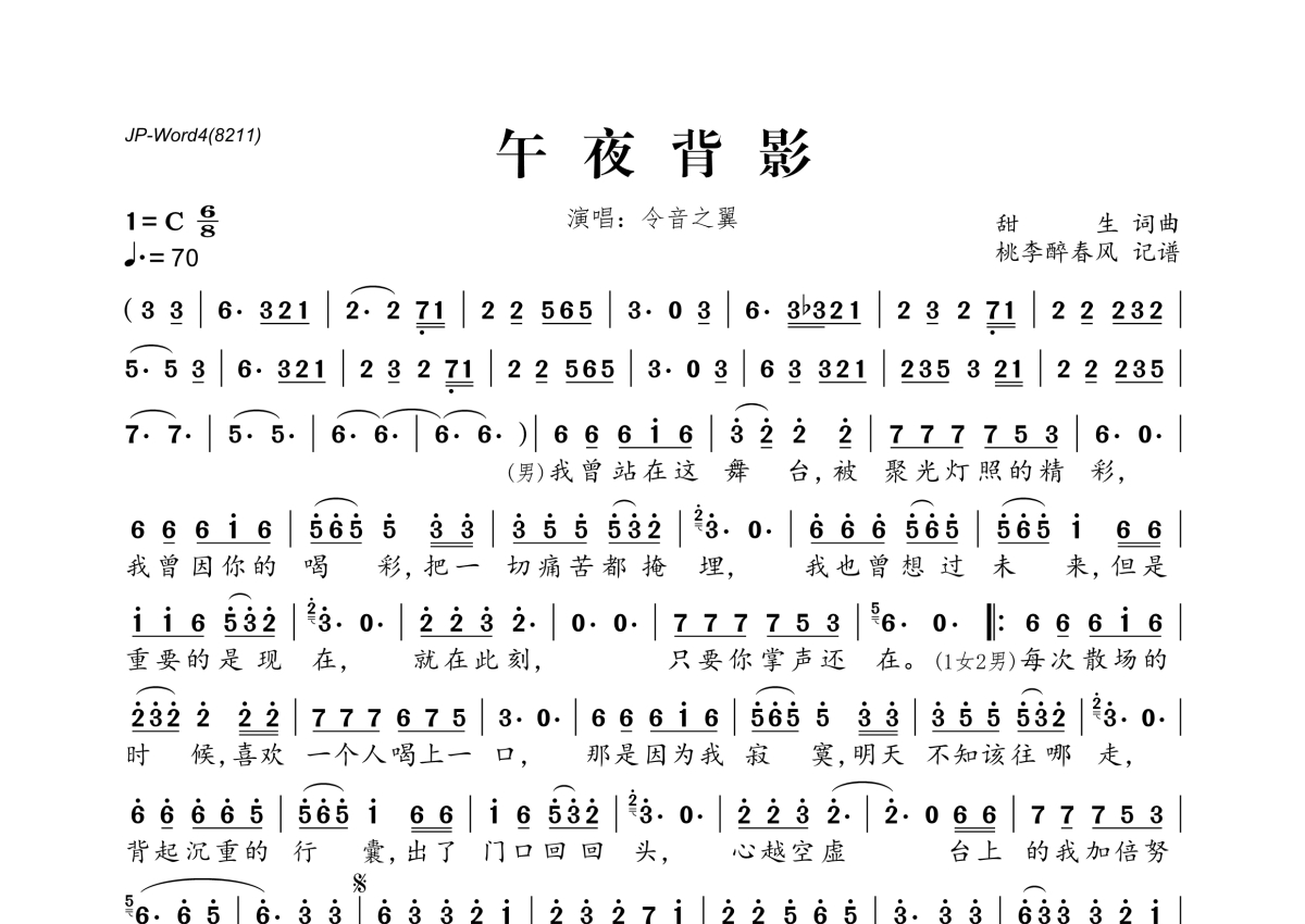 《午夜背影》是令音之翼演唱的一首歌曲,拍号为6/8拍,歌曲速度为每分钟70拍,这份简谱共有一张高清图谱,图谱由 @桃李醉春风 编配上传。