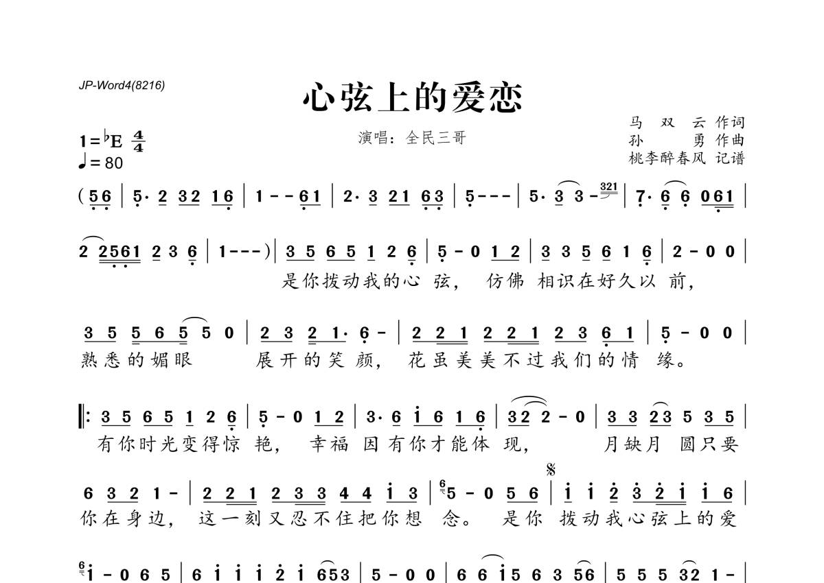 《心弦上的爱恋》是全民三哥演唱的一首歌曲,拍号为4/4拍,歌曲速度为每分钟80拍,这份简谱共有一张高清图谱,图谱由 @桃李醉春风 编配上传。