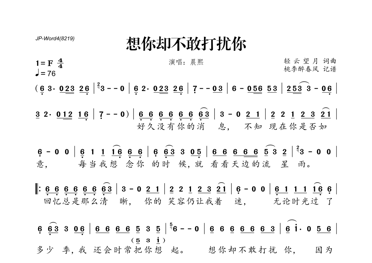 《想你却不敢打扰你》是晨熙演唱的一首歌曲,拍号为4/4拍,歌曲速度为每分钟76拍,这份简谱共有一张高清图谱,图谱由 @桃李醉春风 编配上传。