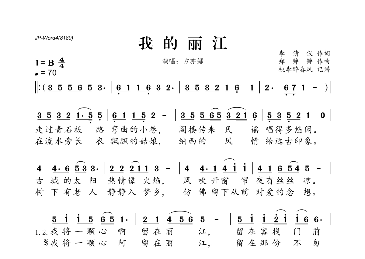 《我的丽江》是方亦娜演唱的一首歌曲,拍号为4/4拍,歌曲速度为每分钟70拍,这份简谱共有一张高清图谱,图谱由 @桃李醉春风 编配上传。