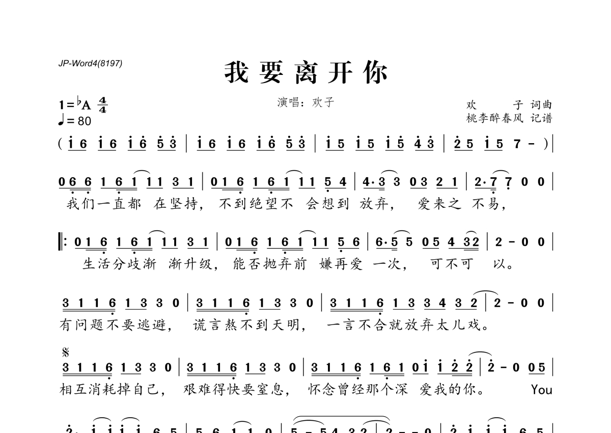 《我要离开你》是欢子演唱的一首歌曲,拍号为4/4拍,歌曲速度为每分钟80拍,这份简谱共有一张高清图谱,图谱由 @桃李醉春风 编配上传。