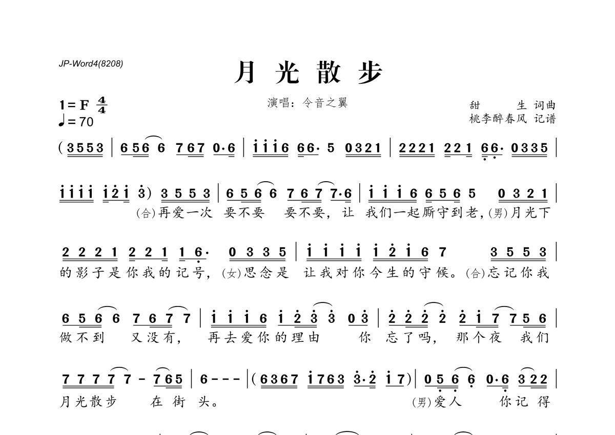《月光散步》是令音之翼演唱的一首歌曲,拍号为4/4拍,歌曲速度为每分钟70拍,这份简谱共有两张高清图谱,图谱由 @桃李醉春风 编配上传。
