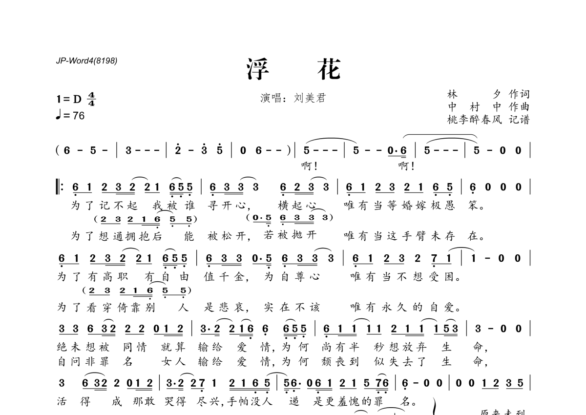 《浮花》是刘美君演唱的一首歌曲,拍号为4/4拍,歌曲速度为每分钟76拍,这份简谱共有一张高清图谱,图谱由 @桃李醉春风 编配上传。