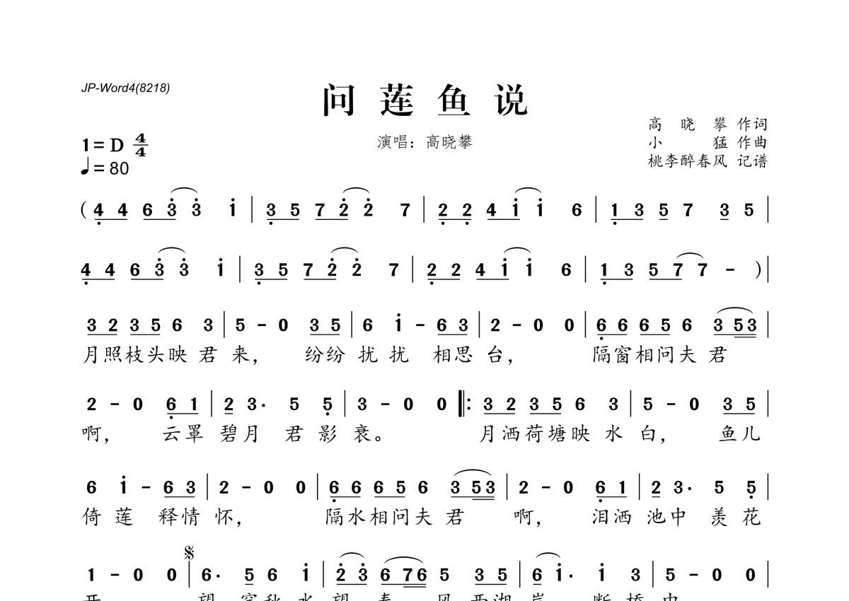 《问莲鱼说》是高晓攀演唱的一首歌曲,拍号为4/4拍,歌曲速度为每分钟80拍,这份简谱共有一张高清图谱,图谱由 @桃李醉春风 编配上传。