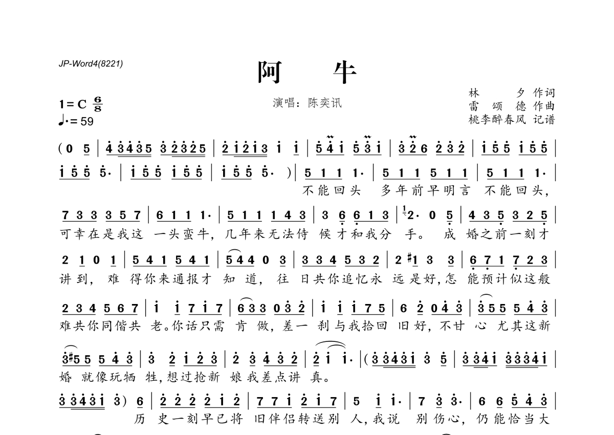 《阿牛》是陈奕迅演唱的一首歌曲,拍号为6/8拍,歌曲速度为每分钟59拍,这份简谱共有一张高清图谱,图谱由 @桃李醉春风 编配上传。