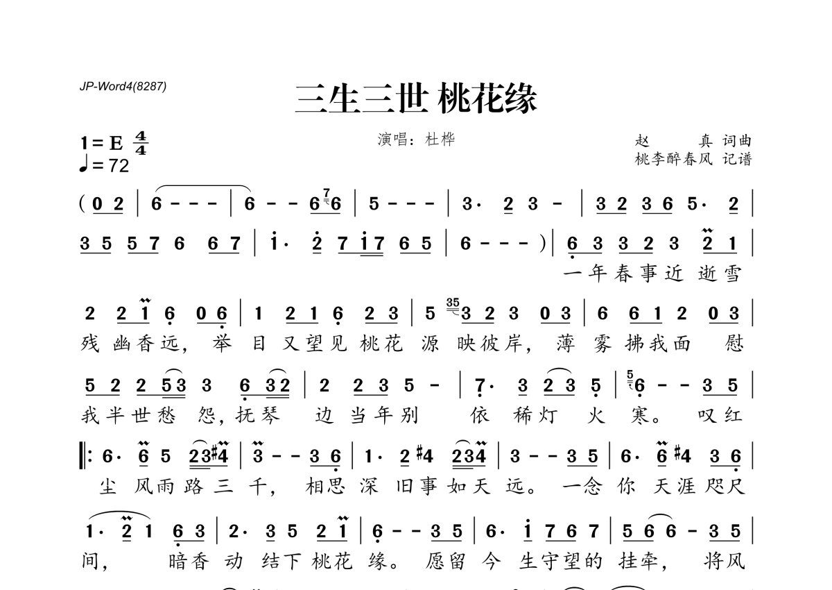 《三生三世 桃花缘》是杜桦演唱的一首歌曲,拍号为4/4拍,歌曲速度为每分钟72拍,这份简谱共有一张高清图谱,图谱由 @桃李醉春风 编配上传。