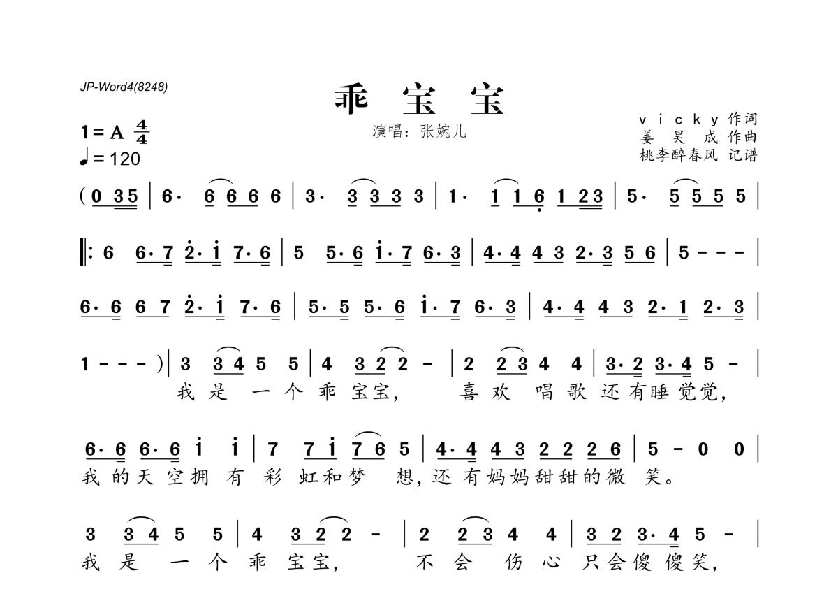 《乖宝宝》是张婉儿演唱的一首歌曲,拍号为4/4拍,歌曲速度为每分钟120拍,这份简谱共有一张高清图谱,图谱由 @桃李醉春风 编配上传。