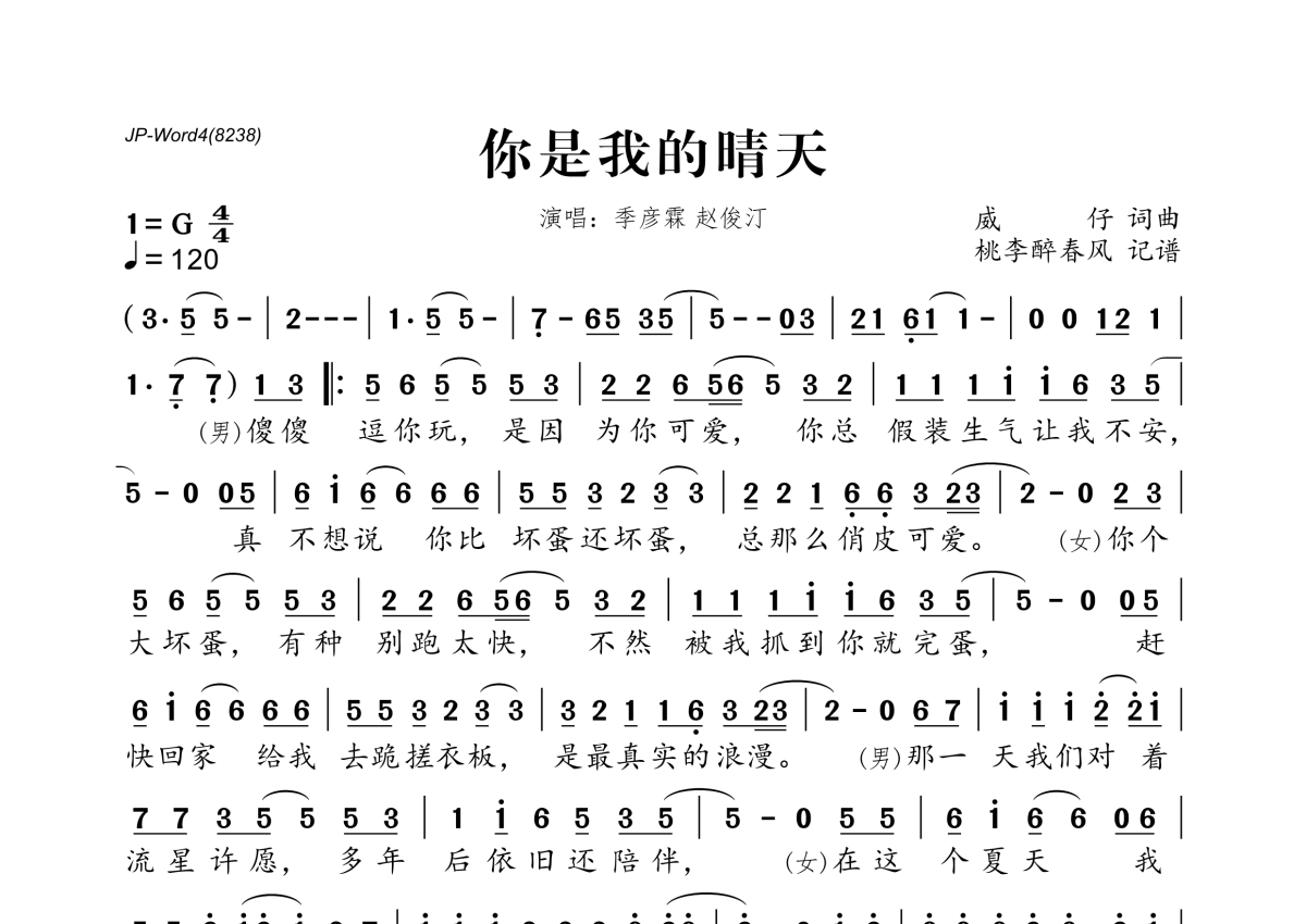 季彦霖&赵俊汀《你是我的晴天》简谱