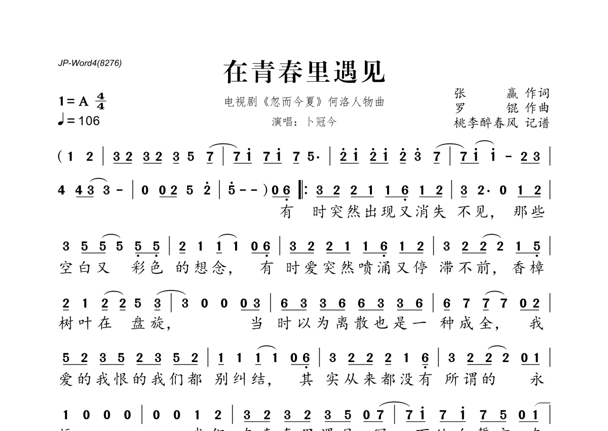 《在青春里遇见》是卜冠今演唱的一首歌曲,拍号为4/4拍,歌曲速度为每分钟106拍,这份简谱共有一张高清图谱,图谱由 @桃李醉春风 编配上传。