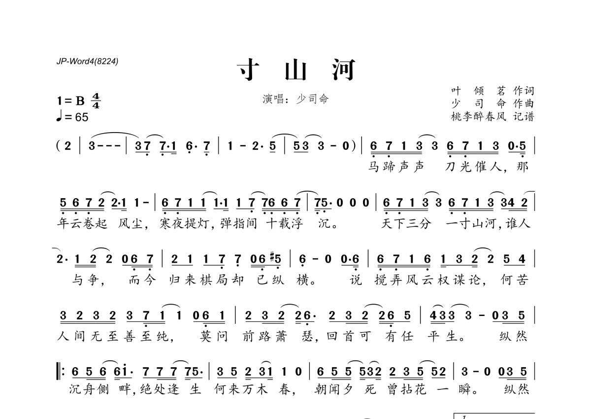 《寸山河》是少司命演唱的一首歌曲,拍号为4/4拍,歌曲速度为每分钟65拍,这份简谱共有一张高清图谱,图谱由 @桃李醉春风 编配上传。