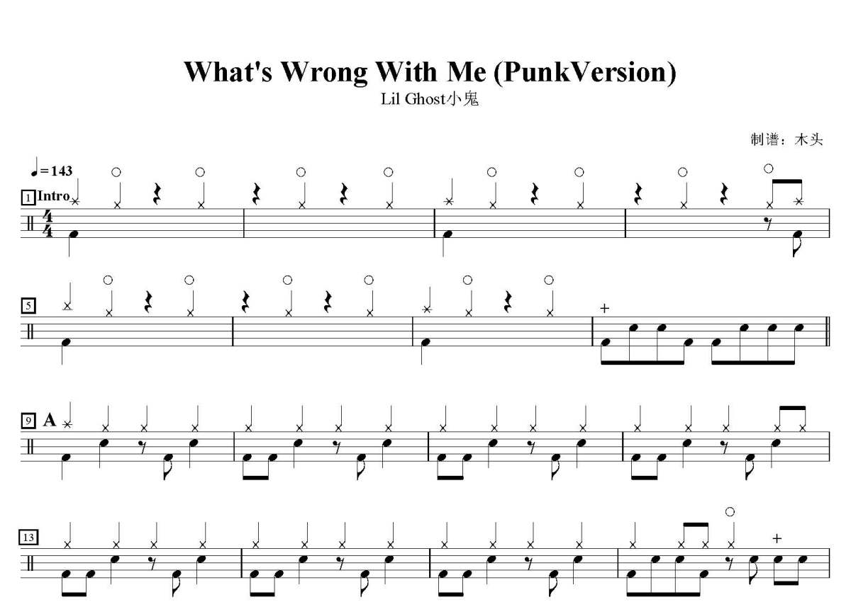 《What's Wrong With Me》是Lil Ghost小鬼演唱的一首歌曲,这份鼓谱共有四张高清图谱,图谱由 @打鼓谱 编配上传,图谱使用五线谱编配,使用这份What's Wrong With Me架子鼓谱,你将能够轻松地敲打出这首Lil Ghost小鬼的What's Wrong With Me,快来尝试吧。歌曲名:What's Wrong With Me (Punk Version), 歌手名:Lil Ghost小鬼, 专辑名:What's Wrong With Me (Punk Version)。