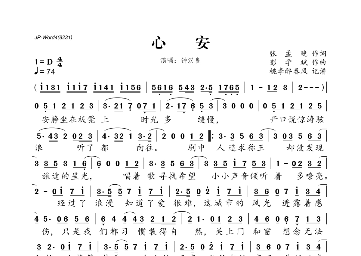 《心安》是钟汉良演唱的一首歌曲,拍号为4/4拍,歌曲速度为每分钟74拍,这份简谱共有一张高清图谱,图谱由 @桃李醉春风 编配上传。