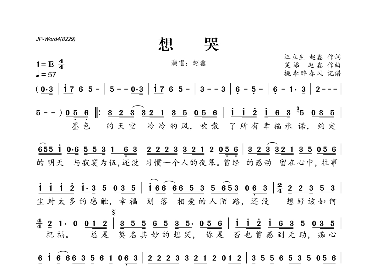 《想哭》是赵鑫演唱的一首歌曲,拍号为4/4拍,歌曲速度为每分钟57拍,这份简谱共有一张高清图谱,图谱由 @桃李醉春风 编配上传。