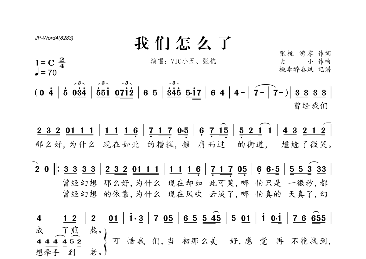 《我们怎么了》是VIC小五&张杭演唱的一首歌曲,拍号为2/4拍,歌曲速度为每分钟70拍,这份简谱共有一张高清图谱,图谱由 @桃李醉春风 编配上传。