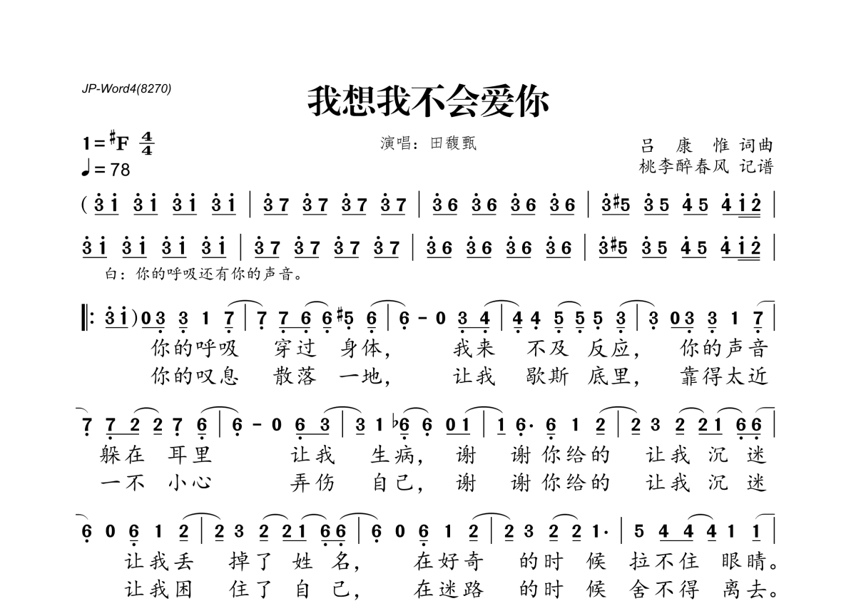 《我想我不会爱你》是田馥甄演唱的一首歌曲,拍号为4/4拍,歌曲速度为每分钟78拍,这份简谱共有一张高清图谱,图谱由 @桃李醉春风 编配上传。