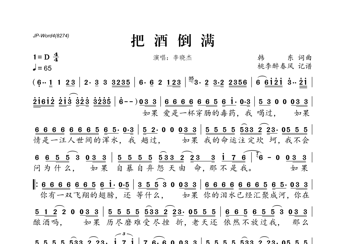 把酒倒满简谱 - 李晓杰演唱